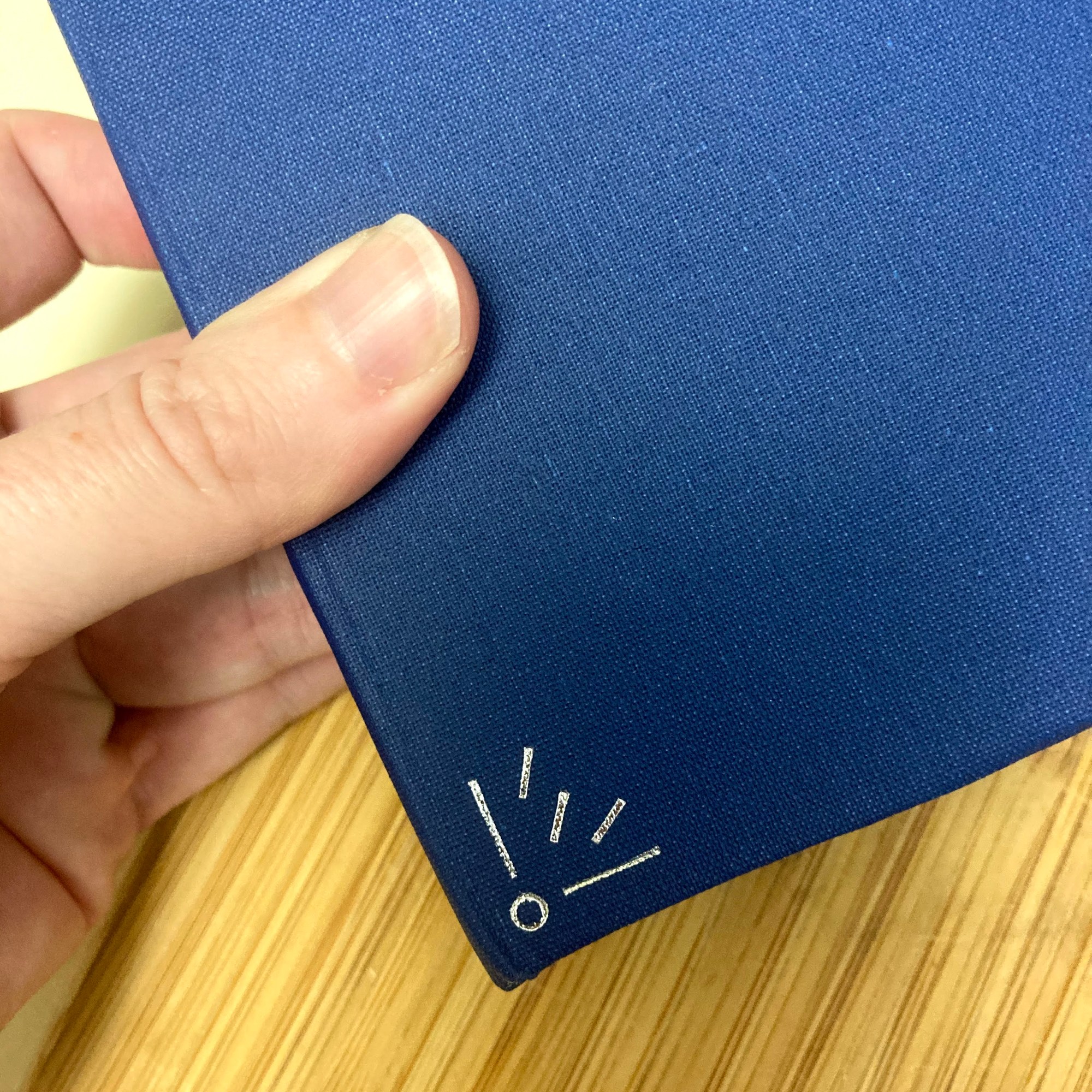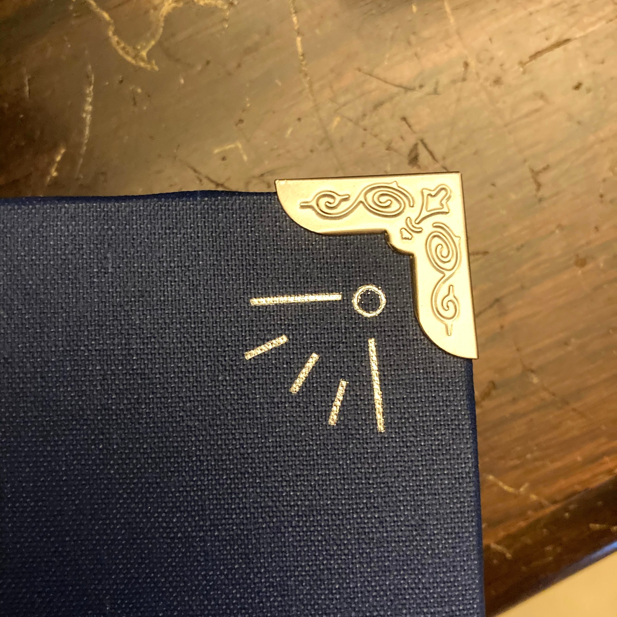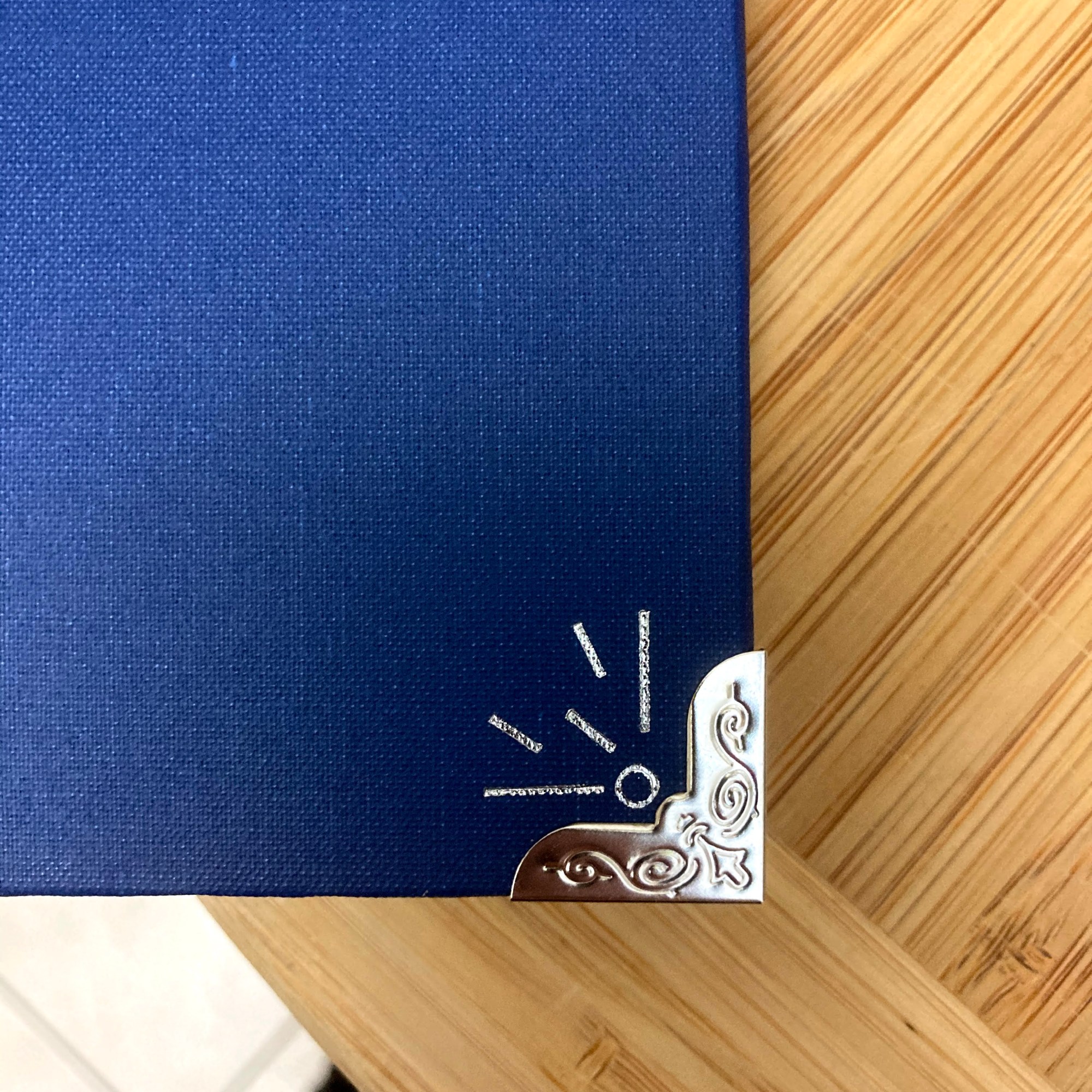 You can really tell the difference the lighting makes. The top and middle photos best represent the true deep royal blue of this bookcloth cover. Hand tooled by me with silver leaf and I’ve added some fun silver metal corners on the front and back edges. (And yes, I forgot to take a photo of the whole book when I was done! Something I definitely need to work on making sure I do moving forward.)