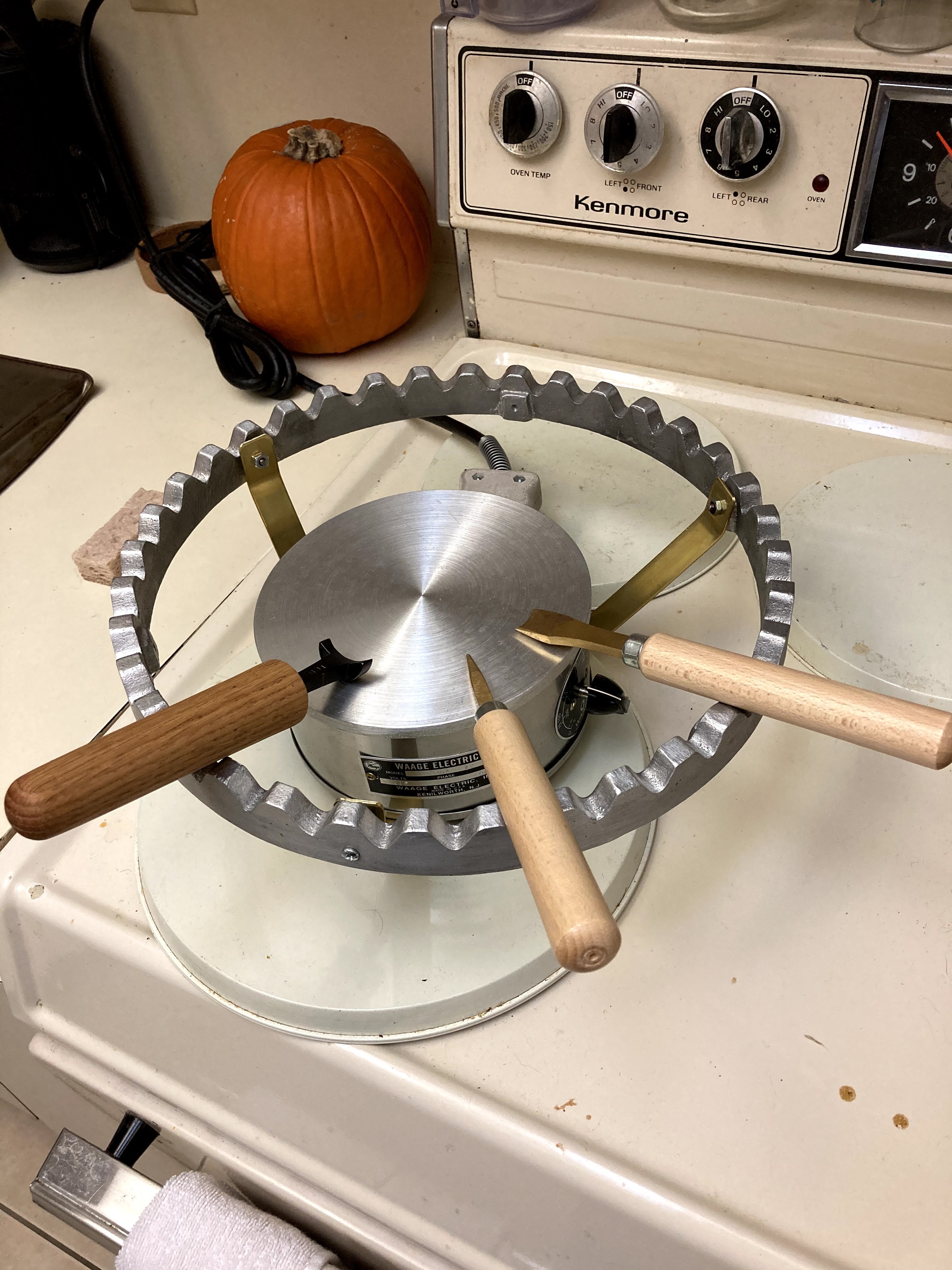 I’m thankful for my partner in gifting me this splendid English finishing stove! Without it I was attempting to heat my tools on our kitchen stove, almost ruining one of the tools in the process. Now I can safely and easily make decorative embellishments! (I’m actually pondering the idea of adding some gold detailing to one of my belts – TBD.)
