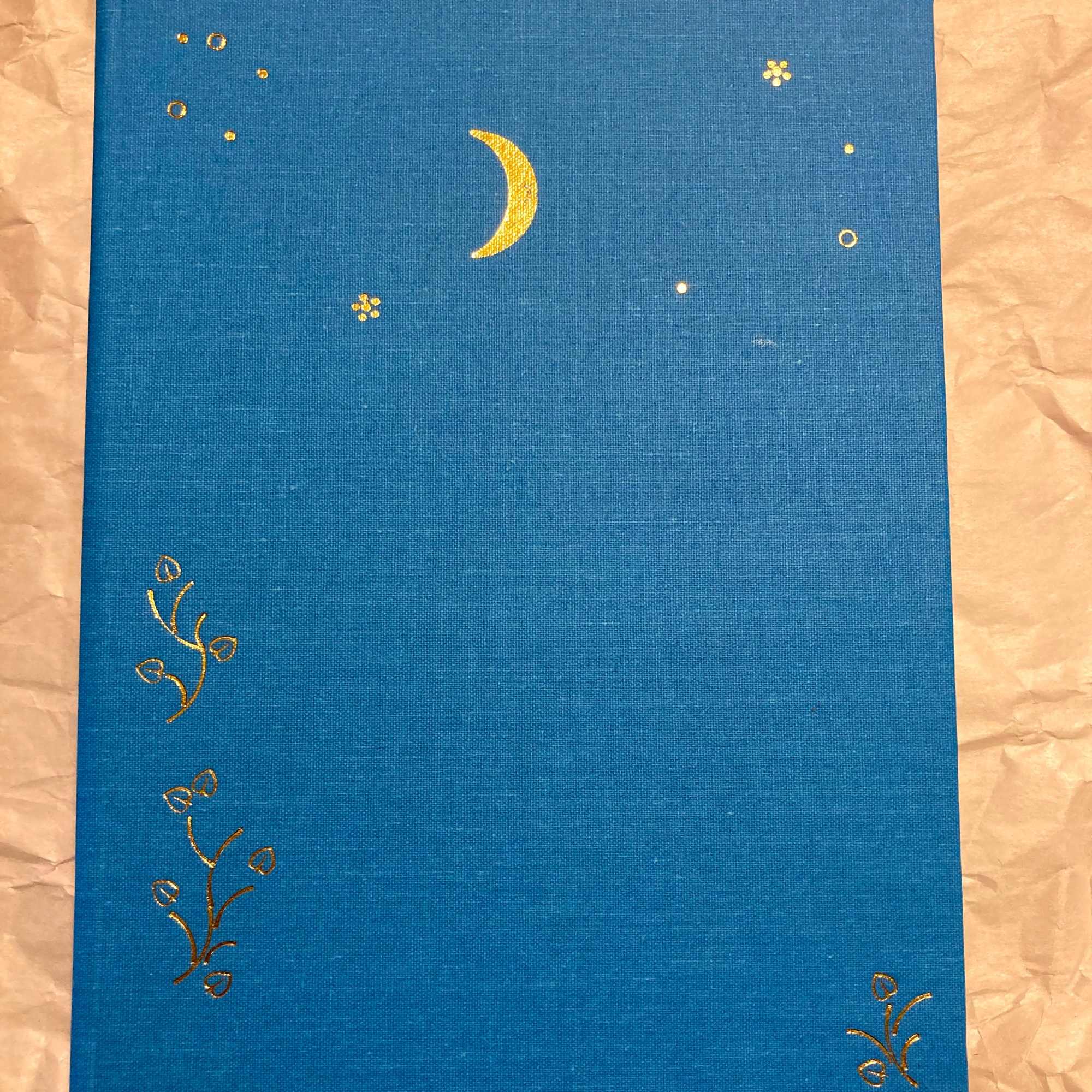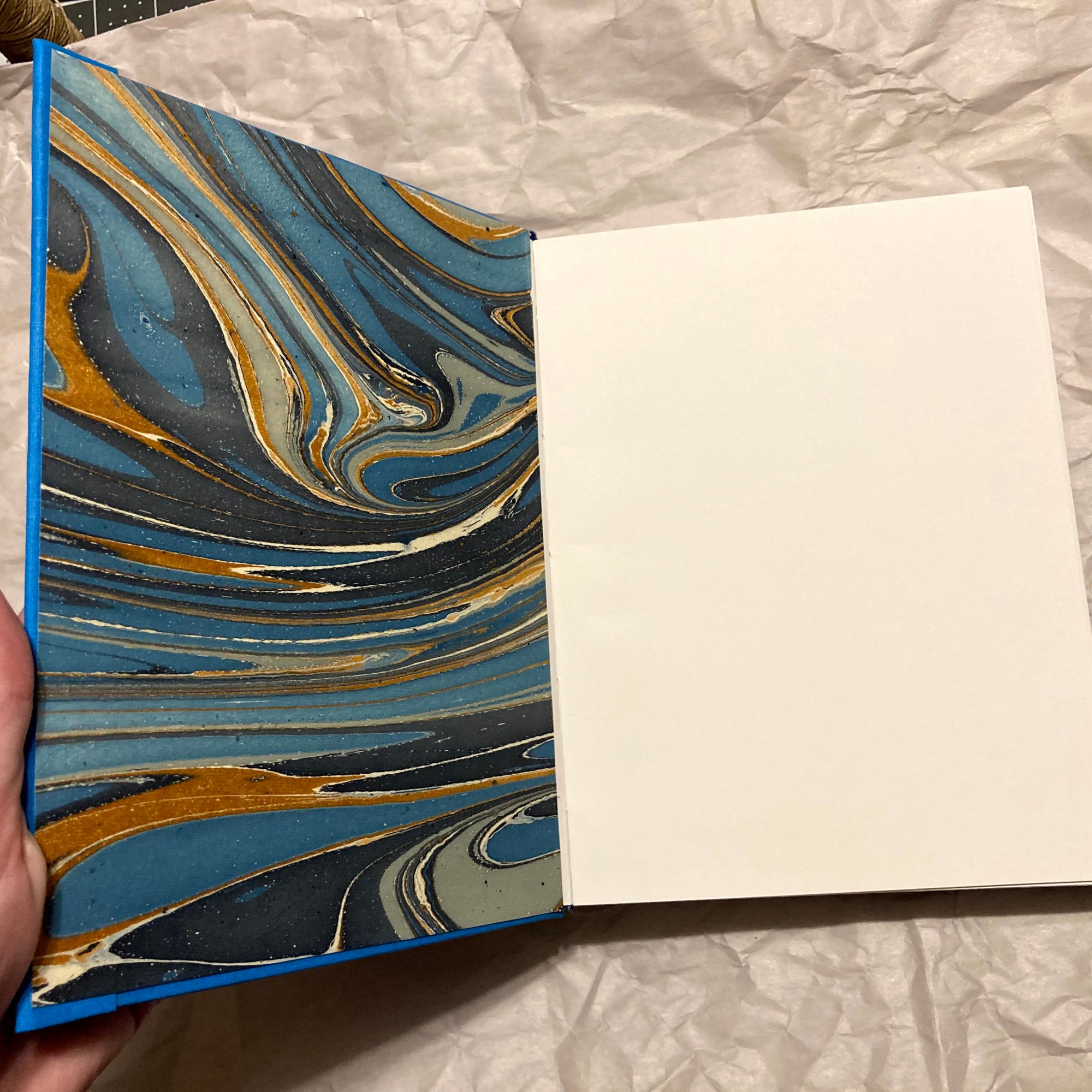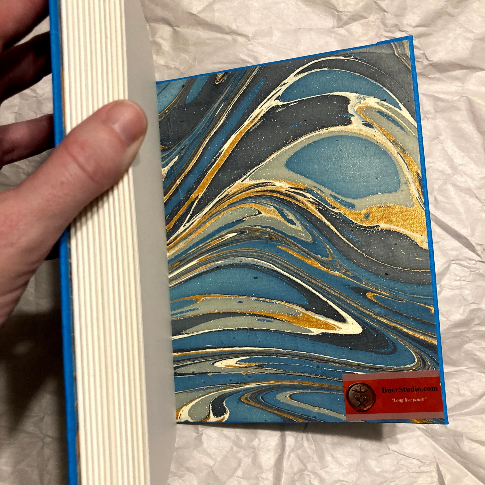 The cover is professional grade bookcloth. I love working with this stuff! The cover art is all hand tooled by me with gold leaf. The moon design is a tool I had custom made by Brien Beidler and it’s absolutely stunning. Complementing hand-marbled paper (purchased, I did not make it) was added to the inside cover.