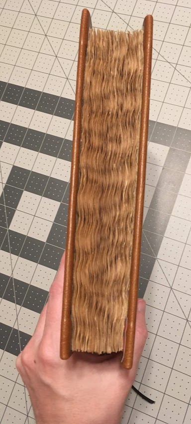 Blind-tooling: A brass tool is heated and carefully applied to leather or bookcloth to create a deep impression/design